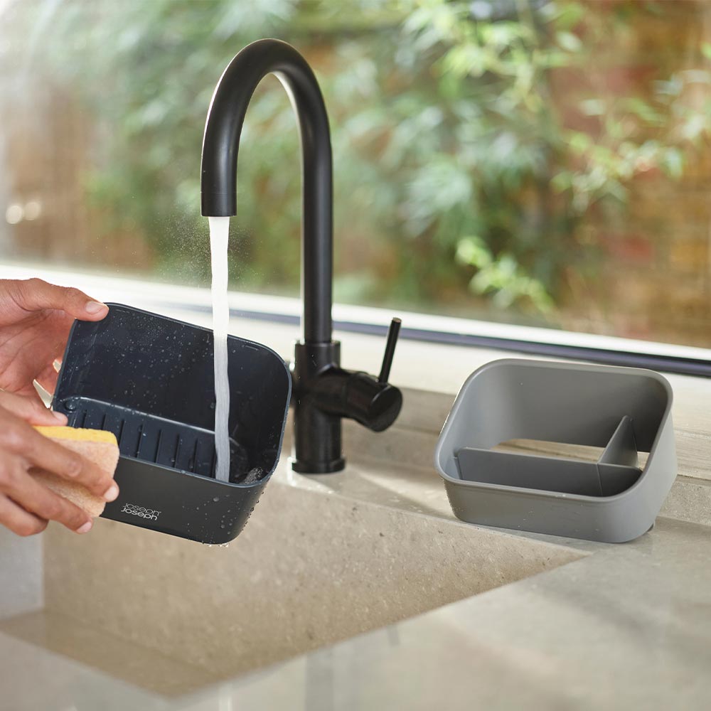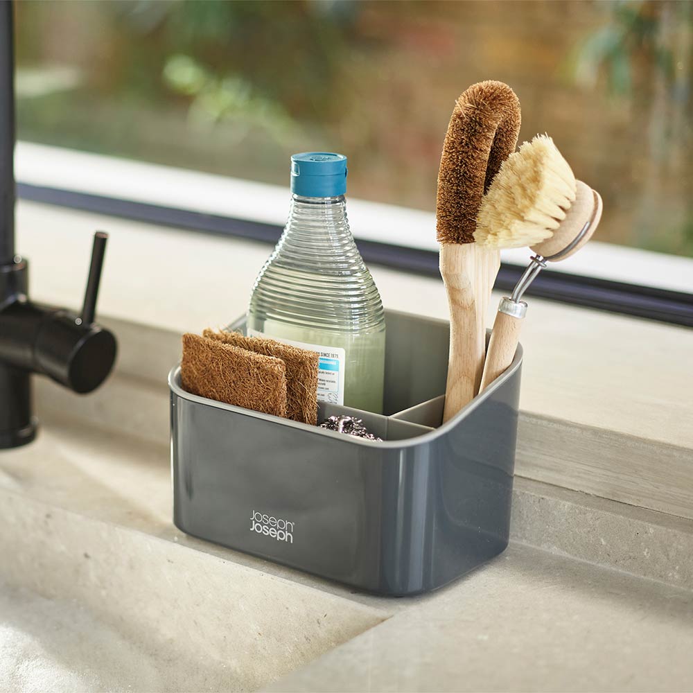 Keep your sink space neatly organised with this stylish Joseph Joseph SinkStore™ Tiered Sink Tidy. It features a generous storage compartment that's divided into three sections for holding a large washing-up liquid bottle, a dish brush, sponges, and scourers. Made of durable plastic the sink tidy can handle the rigorous after dinner clean ups, plus discreetly keep the contents inside hidden from guests view. The angled top makes access easier, and the divider can be removed for easy cleaning. Complete the kitchen set up with the coordinating Joseph Joseph collection.
