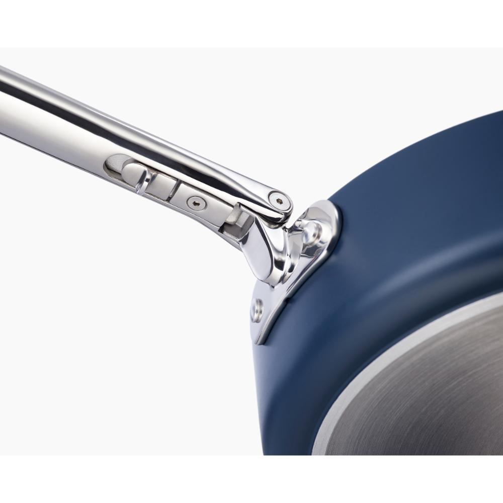 • Nesting design and folding stainless-steel handles save up to 50% more space than a standard 3-piece pan set. Handles 20-year lifetime tested
