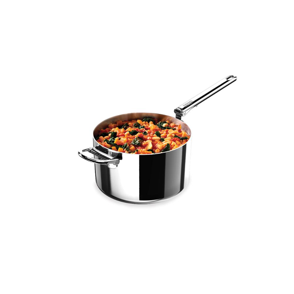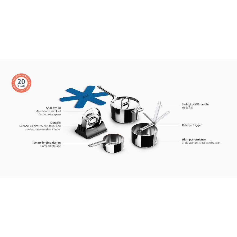 Goodbye clutter, hello Space! This 3-piece saucepan set nest neatly together and feature clever, folding stainless-steel handles that save up to 50% more space than standard pans when stored. The set also includes two felt pan protectors for scratch-free storage. Engineered to last, the handles feature our patented and fail-safe SwingLock™ mechanism that locks the handle securely into position during use and optimises space when folded. When it comes to cooking performance there's no compromise either. The pans feature a high-performance 3-ply construction, including an even-heat aluminium core sandwiched between layers of stainless steel for optimal heat distribution. Each pan comes with a stainless-steel lid that also has a folding handle, a smart pan- lid stand and a pair of felt pan-protectors, making compact storage even easier. Suitable for all hob types, including induction, this set is part of the Space cookware range - created for cooks, made for storage.