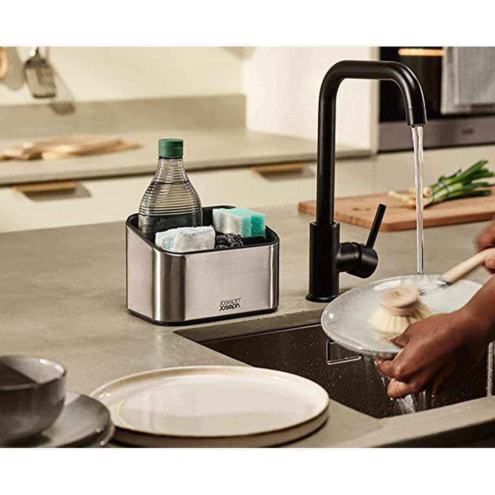 Keep a smart, stylish, organised sink area with the Joseph Joseph Surface Tiered Sink Tidy Grey. With its fingerprint-proof, stainless-steel exterior, the Joseph Joseph Surface Tiered Sink Tidy Grey gives your kitchen a sleek, sophisticated aesthetic. The caddy, designed to hold essential washing-up items, features multiple compartments in an angled shape for super organised, easy access. There’s space for a washing-up liquid bottle, brushes, sponges and scourers. Non-slip feet keep it firmly in place, while excess water drains neatly into the base of the Joseph Joseph Surface Tiered Sink Tidy Grey. The whole unit can be effortlessly dismantled for easy emptying and cleaning.