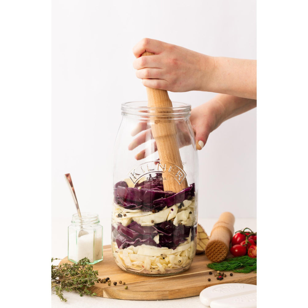 The Kilner® Fermentation Packer is an essential tool for preparing and packing vegetables to create fermented foods such as Sauerkraut and Kimchi. Made from beechwood, the Fermentation Packer features a textured mashing head designed to help break down the ingredients, eliminate air bubbles, and release the tangy flavours synonymous with fermented foods. The packer is suitable for use with the Kilner® 3 and 5 litre specialist Fermentation Sets, but it can also be utilized with a variety of wide mouth jars from the collection.