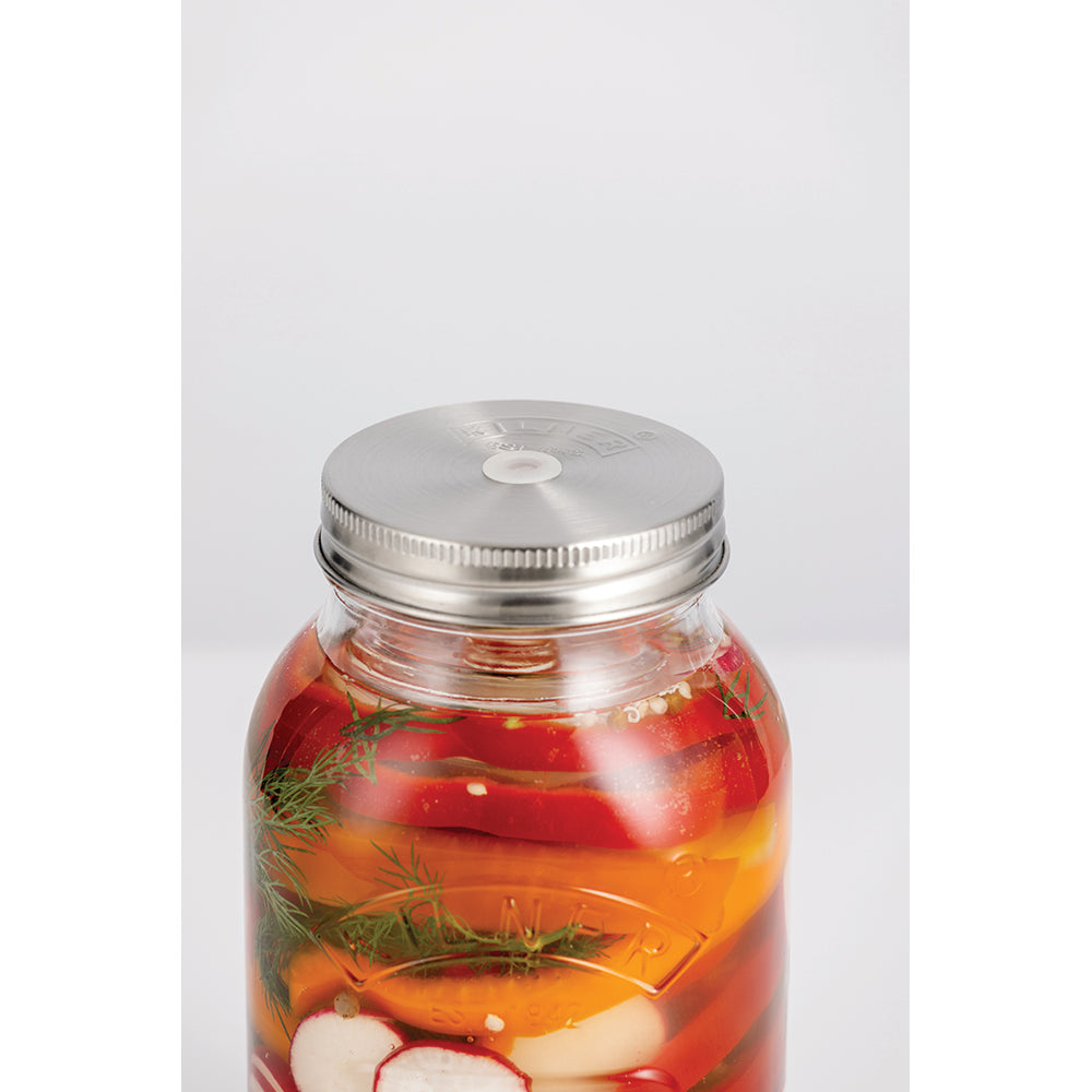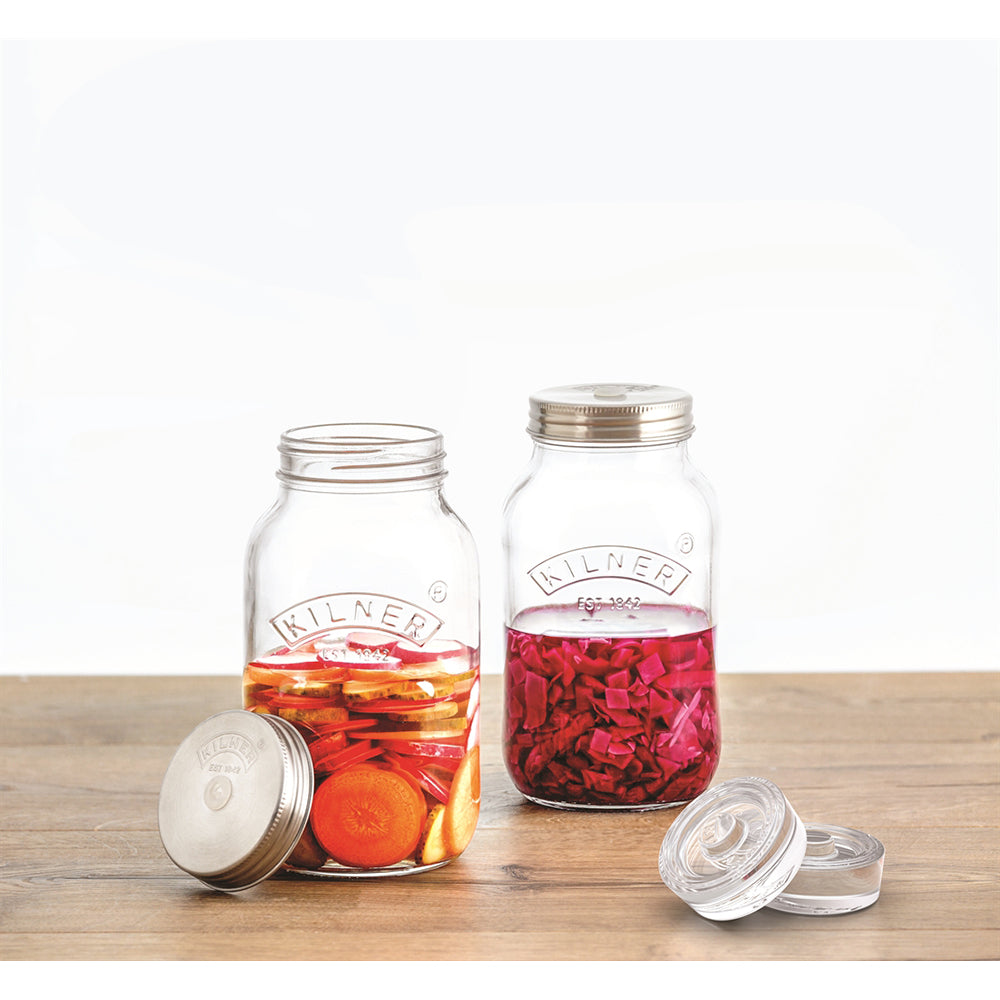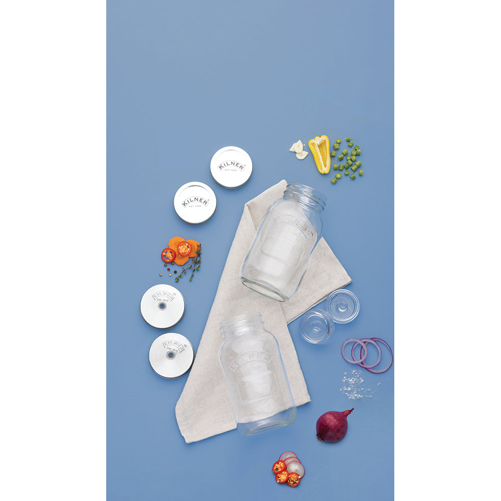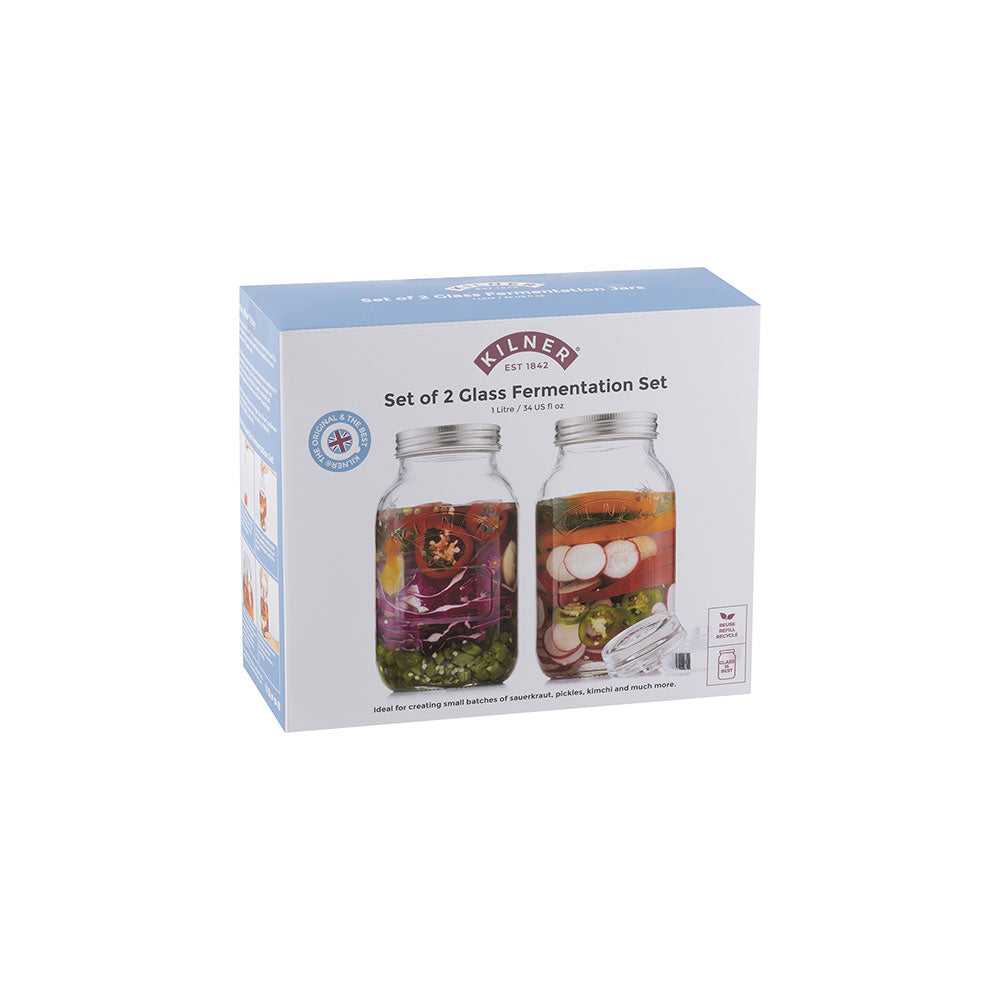 - Includes: 2 x 1L jars, 2 x glass weights, 2 x stainless steel lids with silicone valves, 1 x recipe book