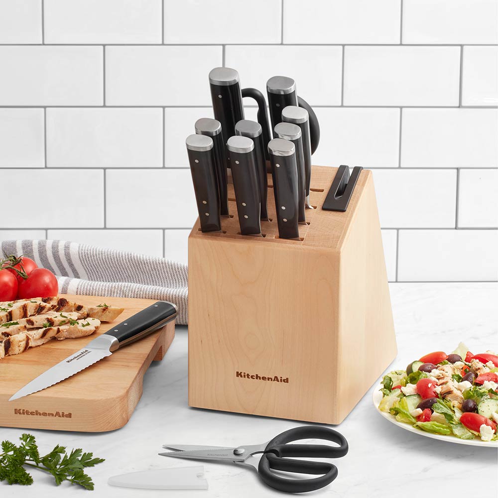 The exceptional KitchenAid 11 Piece Knife Set with Sharpener empowers you to effortlessly blaze through food prep. It includes an array of indispensable tools: all-purpose shears, a 9cm paring knife, 18cm santoku knife, 20cm bread knife, 20cm chef knife and six steak knives. Crafted from semi-polished, high-carbon Japanese Steel, the KitchenAid 11 Piece Knife Set with Sharpener is the epitome of precision and durability. With blades expertly hardened and tempered, you're guaranteed a long-lasting, professional-quality edge. The knives are elegantly housed in a birch wood block that boasts a built-in sharpener, ensuring ultimate convenience and style in your kitchen.