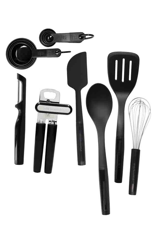 The KitchenAid 15-piece Kitchen Utensil Set includes a slotted turner, cooking spoon, scraper spatula, euro peeler, multi-function can opener and utility whisk, plus a set of four measuring cups and a set of five measuring spoons.