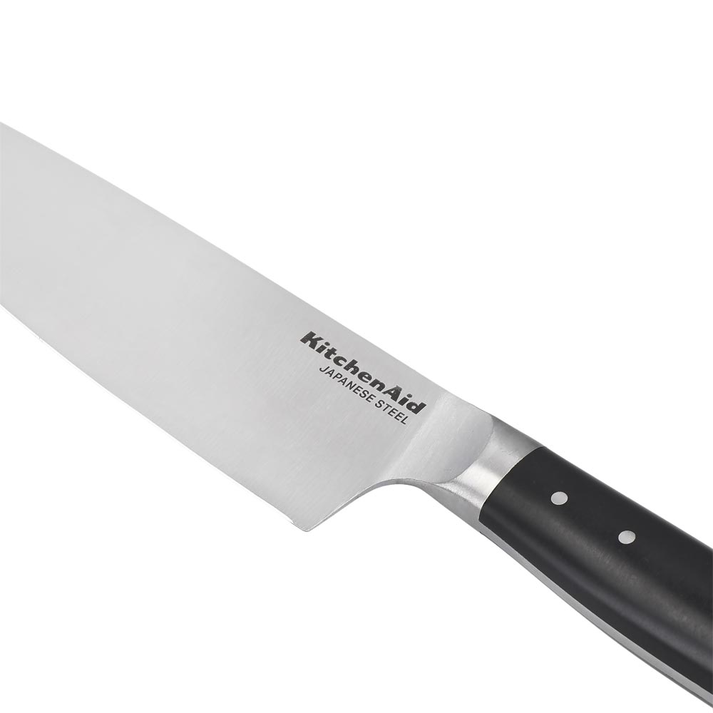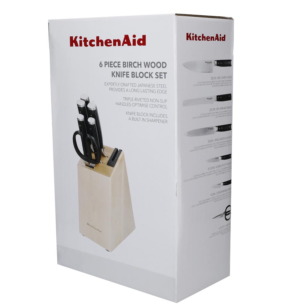 The exceptional KitchenAid 6 Piece Knife Set with Sharpener empowers you to effortlessly blaze through food prep. It includes an array of indispensable tools: all-purpose shears, a 9cm paring knife, 11cm utility knife, 20cm carving knife, 20cm bread knife, and a 20cm chef knife. Crafted from semi-polished, high-carbon Japanese Steel, the KitchenAid 6 Piece Knife Set with Sharpener is the epitome of precision and durability. With blades expertly hardened and tempered, you're guaranteed a long-lasting, professional-quality edge. The knives are elegantly housed in a birch wood block that boasts a built-in sharpener, ensuring ultimate convenience and style in your kitchen.