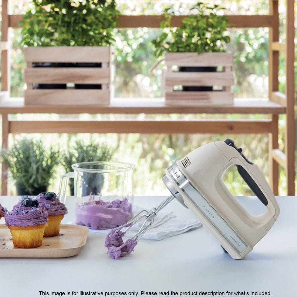 Expand your culinary repertoire and whip up all kinds of delicious recipes using the KitchenAid Artisan 9 Speed Hand Mixer! Fantastic for kneading, whipping, mixing and more, this versatile appliance is a great way to enhance your culinary collection. The beautiful colours features an eye-catching glossy finish that looks fantastic in any culinary space. This hand mixer features a soft ergonomic grip for comfort and control when in use. This advanced hand mixer is designed with a built-in electronic mixing sensor which automatically adjusts the mixing speed to the resistance of the load. It includes two stainless steel TurboBeater II beaters, a stainless steel 16-tine pro whisk, two stainless steel dough hooks and a liquid blending rod to take care of all your everyday mixing needs. Prepare buttercream frosting or a light and fluffy cake mixture with the KitchenAid Artisan 9 Speed Hand Mixer!