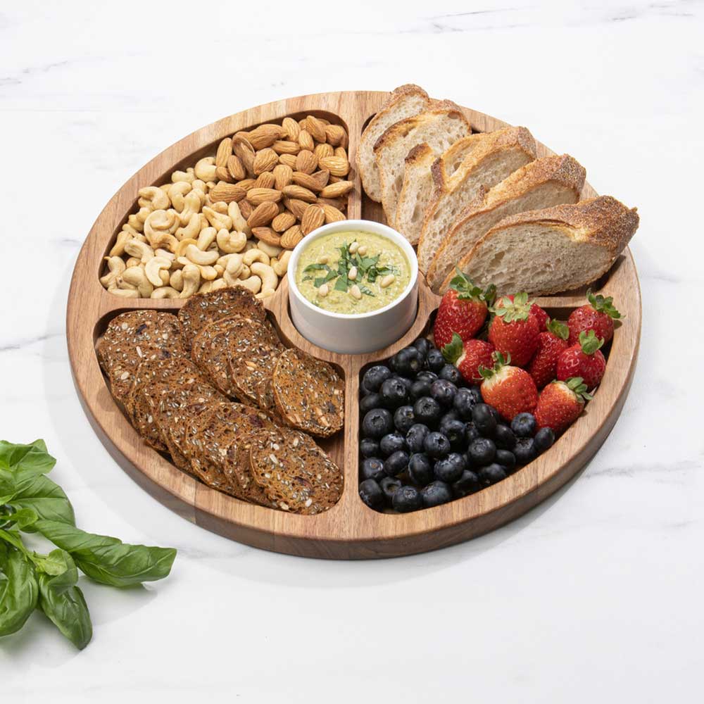 This platter has been designed to cater for everyday use, casual dining, and special occasions. Handcrafted from high-quality Acacia timber, the platter is sectional, allowing for different foods to be served, and features a bowl in the centre, ideal for dips or sauces.
