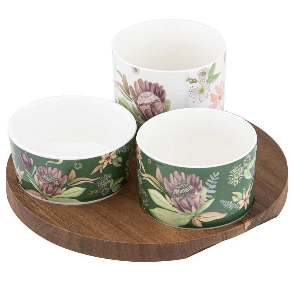 • Set of 3 serving bowls and acacia tray• Hand painted floral design on handles