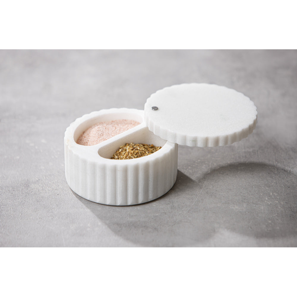 • Natural white marble• Sliding lid and 2 compartments for salt or spices