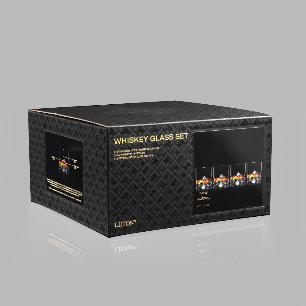 Complete your whiskey collection with the Everest whiskey glass. 1:1 scale replica of the Everest mountain Chill charge exchange system chills whiskey in less than 18 seconds 100% lead free crystalline glass Solid and durable