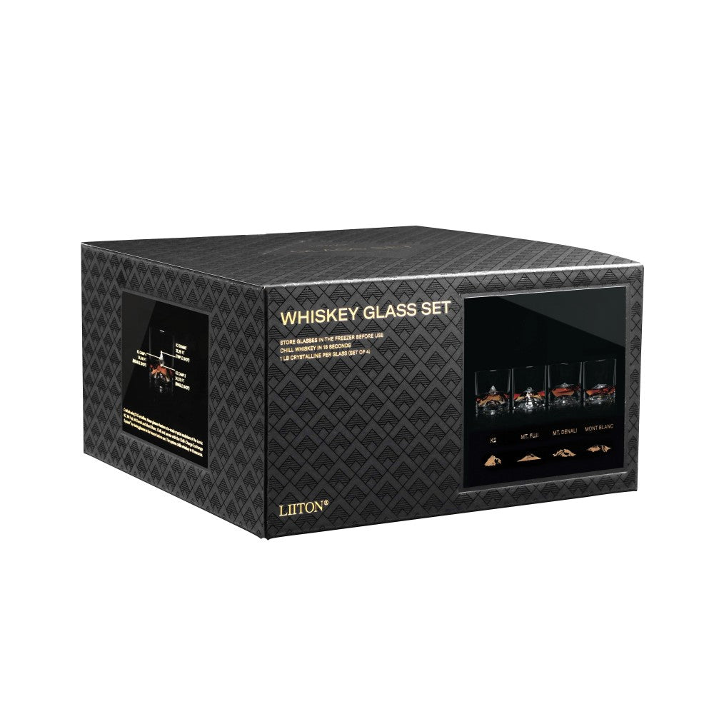 Crafted using X1 Crystalline, the Peaks Glass is the only true precision glass sculpture of iconic mountains in a Crystal glass. The set includes one of each four iconic Mountains - Denali, Mont Blanc, K2 and Mt. Fuji. The Patented Chill-Charge System™ chills down your drink in just 18 seconds. Quickly release whiskey aromas by swirling the spirits gently around the faces of the Peaks.