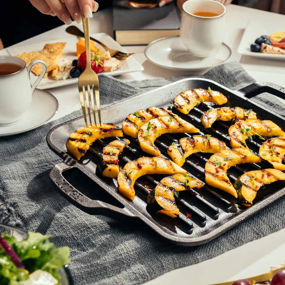 The modern design of the Lodge 28cm Seasoned Cast Iron Chef Style Square Grill Pan elevates cooking through thoughtful design inspired by chefs and is seasoned to bring out rich flavours.