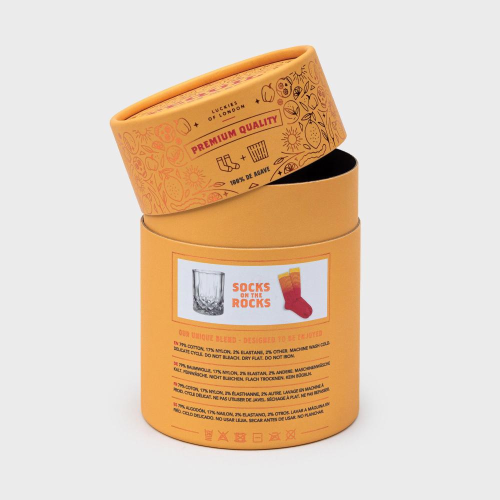 Luckies Tequila Socks On The Rocks - Two Socks, One Glass, Pure Class. Premium packaging, like the real thing. Cotton-rich socks for smooth comfort. Cut-glass tumbler for smooth drinking. The perfect blend of comfort and Style. Slip into comfort and cocktails with our Tequila Socks on the Rocks, perfect for those who enjoy a fiesta for their feet! Crafted for your feet, this set includes a stylish glass with a pair of socks within for ultimate, smooth comfort. Elevate your sock game and enhance your boozing. A remarkable gift for those who appreciate both of life's little pleasures!
