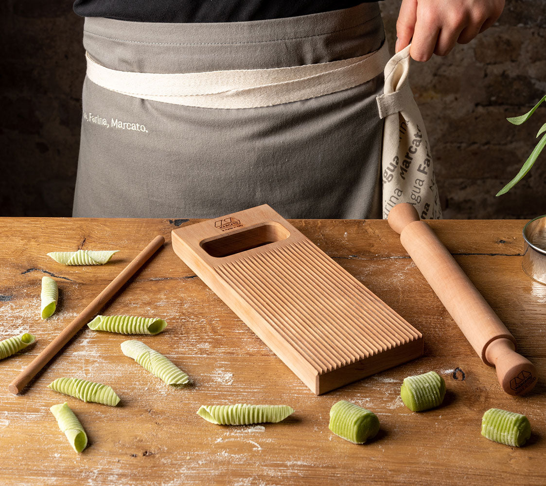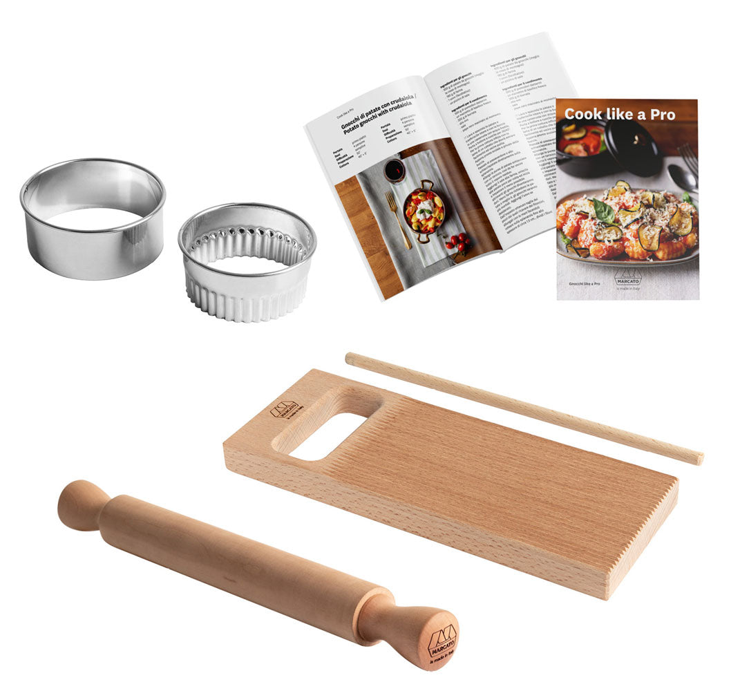 • Includes a gnocchi board with a garganelli accessory, rolling with made from pear wood, 1 x smooth ring, 1 x fluted ring, apron and recipe book