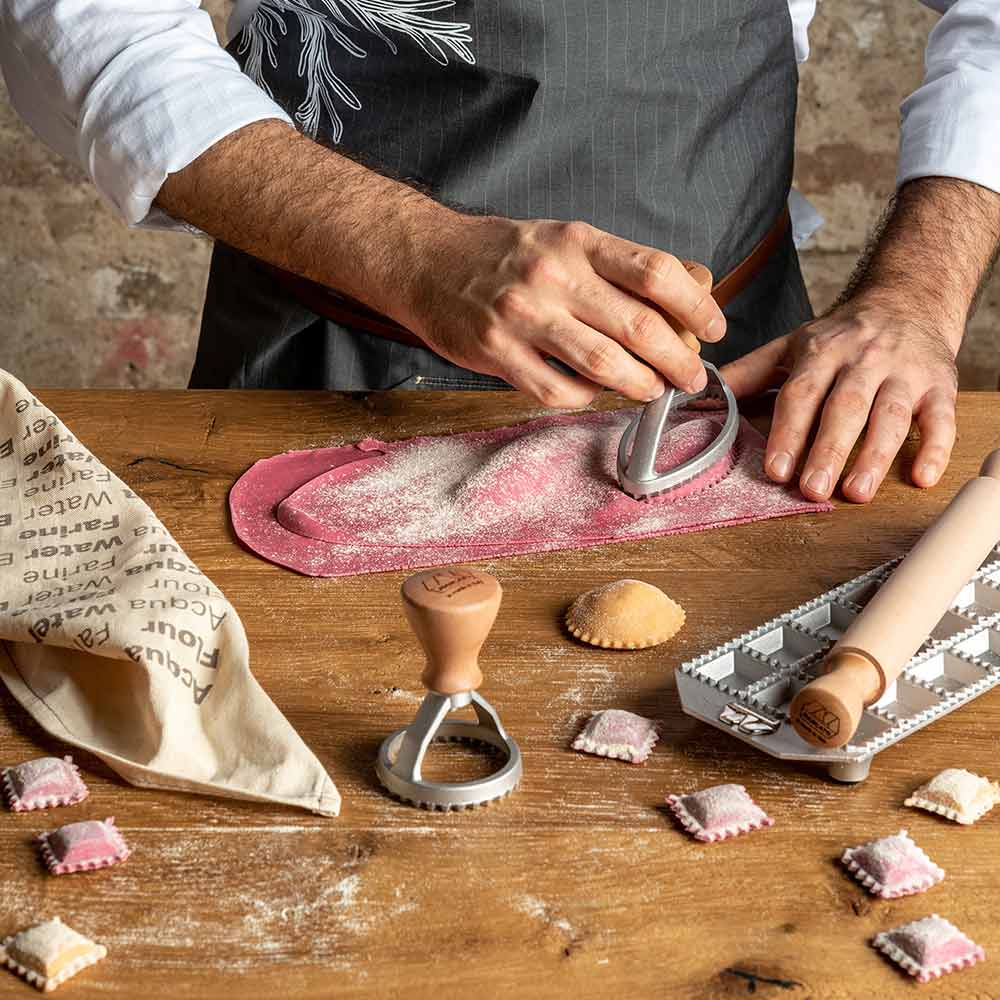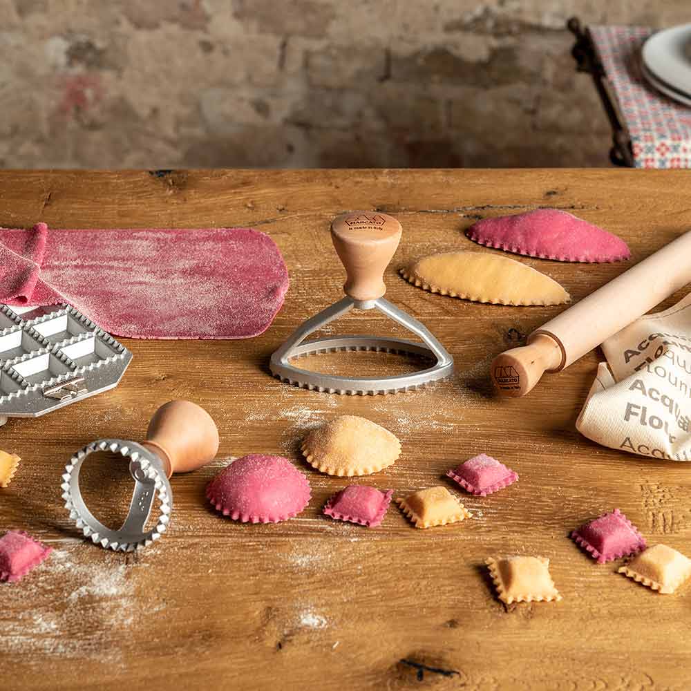 • Made in Italy• Includes a ravioli tray (24 x square), rolling pin, oval ravioli stamp, round ravioli stamp, tea towel & recipe book