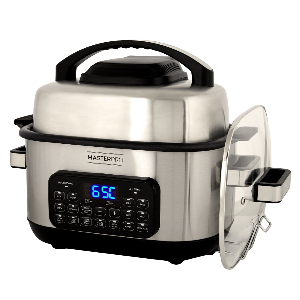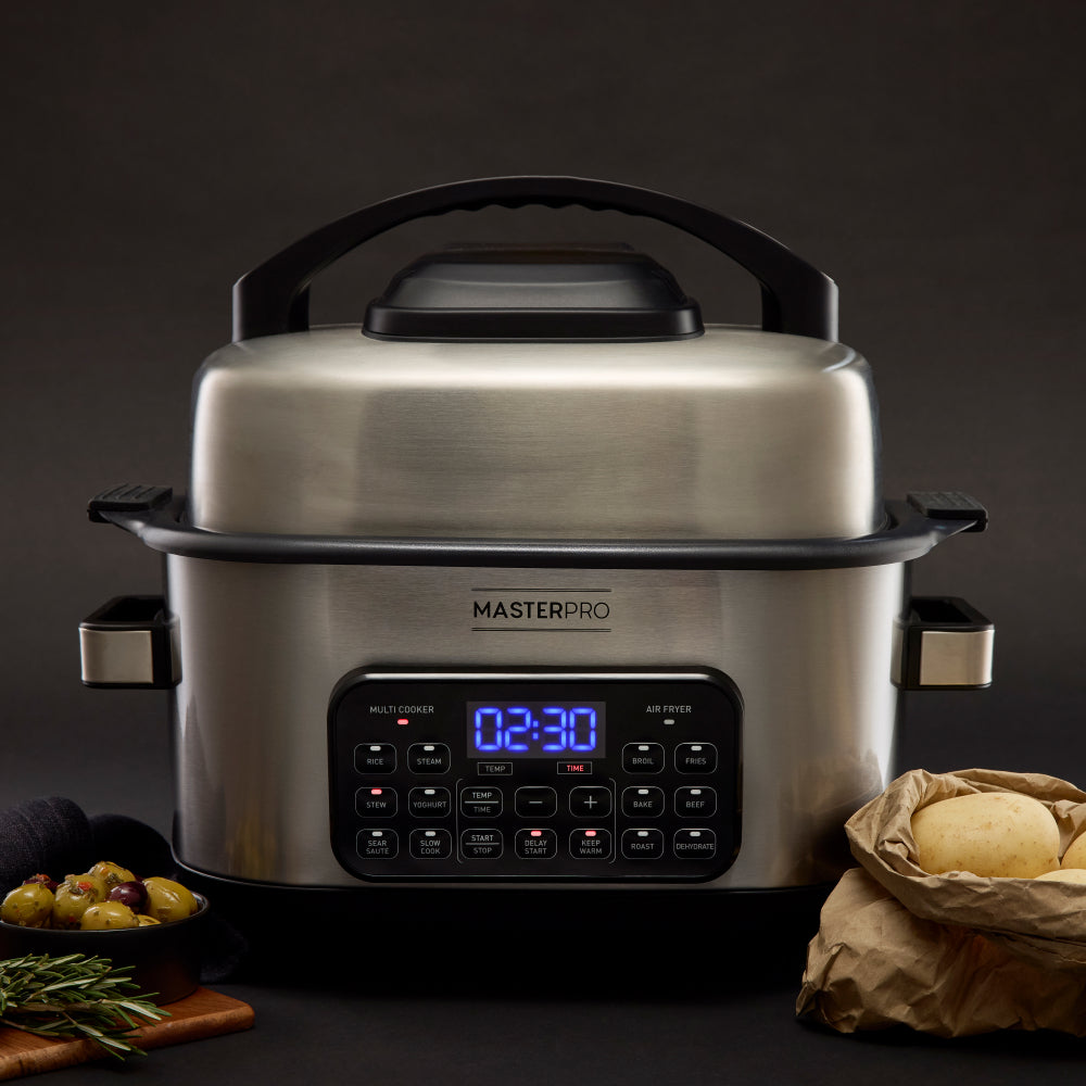 MasterPro is a quality kitchenware brand that equips the home chef with tools to cook like an expert. Our products are designed for superior functionality, durability and style. The 14-in-1 6L Deluxe Multi Cooker + Air Fryer lets you create delicious family feasts by combining multi cooker and air fryer functions in one handy appliance. The dual lid functionality lets you effortlessly transition between air fryer and multi cooker modes by switching lids. Its 6L capacity along with Delay Start and Keep Warm functions lets you cook large meals for family gatherings or meal prep in advance. Features 14 preset options including sauteing, slow cooking, broiling, baking, steaming and more. Enhance your cooking experience with the 14-in-1 6L Deluxe Multi Cooker + Air Fryer from MasterPro.