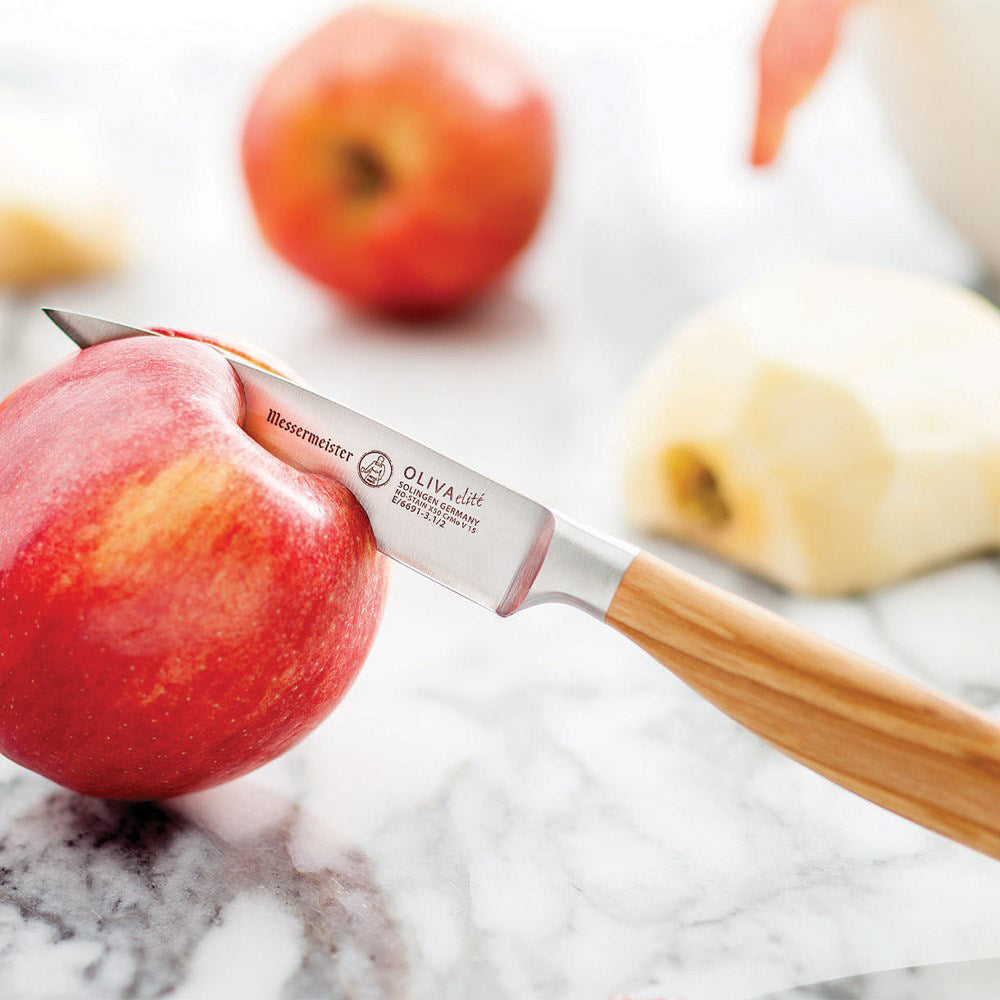 Upgrade your knife collection with the stunning craftsmanship of Messermeister and the Oliva Elite Spear Point Paring Knife. Fully forged from the finest quality German steel with a complete tang and a stunning Mediterranean olive wood handle, the Messermeister Oliva Elite Spear Point Paring Knife is as attractive as it is useful. Featuring an ingenious bolster-less design, the Messermeister Oliva Elite Spear Point Paring Knife provides a simplified yet superior approach to cutting, sharpening, and honing tasks that makes use of the entire blade from heel to tip. Slice through meats, vegetables, roasts, and more with pure ease and in complete comfort.