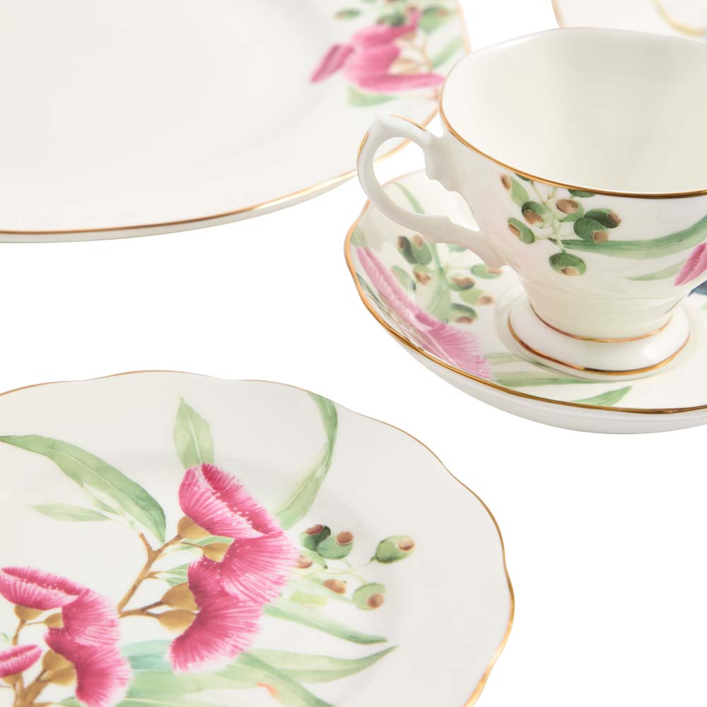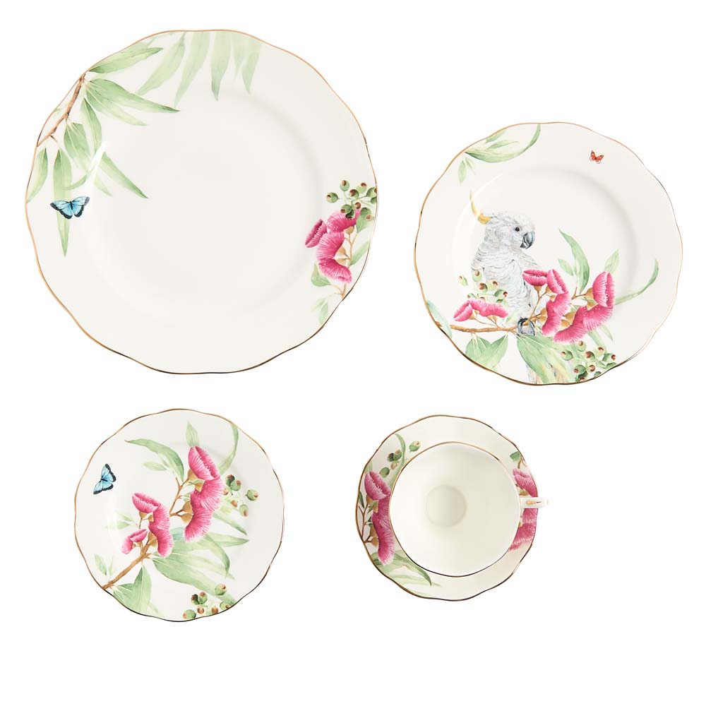 Perfect alone, when viewed as a set, the fine bone china Miranda Kerr for Royal Albert Australiana 5 Piece Dinnerware Set vibrant colour and floral reminiscences are only intensified. Catching the eye are those artful designs, featuring native Australian birds and plants such as eucalyptus and cockatoos, taken from Miranda's own memories of her birthplace. A fitting final flourish is the gold banding, which adds a glinting accent to the aesthetic. All told, this fun, joyful dinnerware collection offers all you need to turn any meal into an occasion.