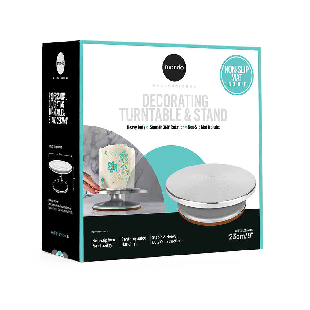 Unleash your creativity and achieve flawless cake decorating with the Mondo Professional Turntable. This must-have decorating tool is designed for cake decorators of all levels with its sturdy aluminium construction and weighted nonslip base providing unmatched stability, and the double ball bearings ensuring a smooth and seamless 360-degree rotation with every turn. Positioning your cake is easy with the Mondo Turntable’s convenient centring guide markings and when it's time to showcase your creation, this versatile turntable can be used as a cake stand to display your masterpiece.