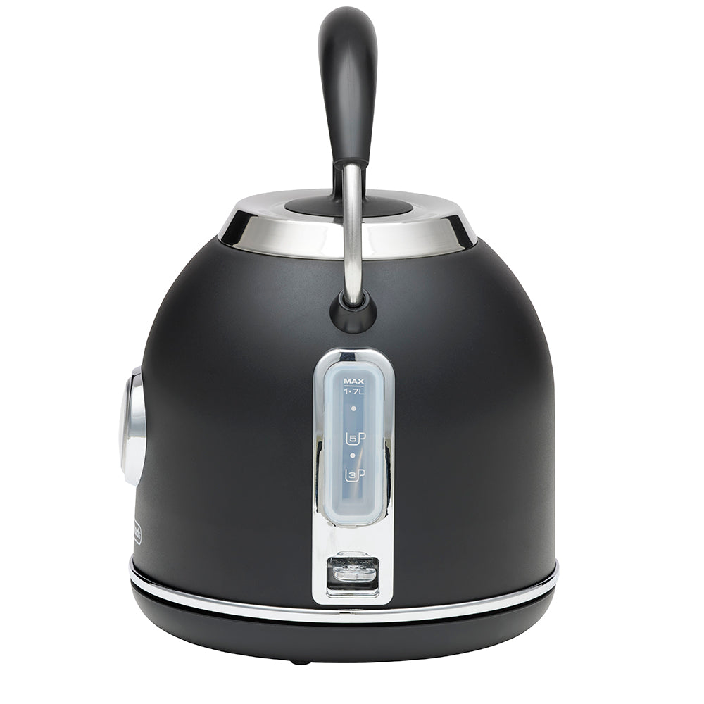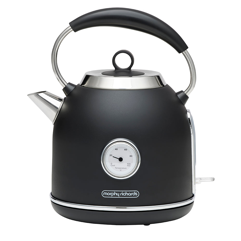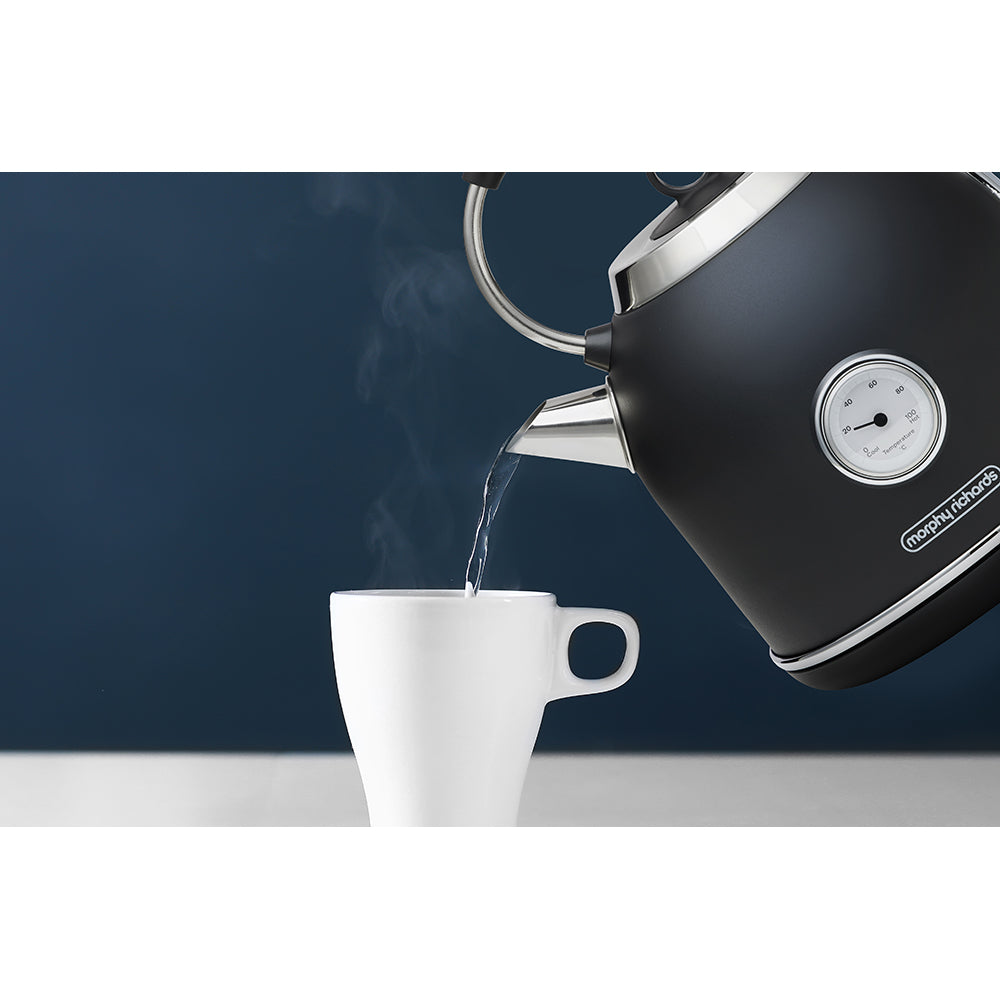 Transform your kitchen with the Morphy Richards Boutique 1.7L Retro Kettle in sleek black. Inspired by contemporary trends, this kettle exudes effortlessly sophisticated style. The built-in thermometer allows you to monitor water temperature, while the easy-view water window ensures you never run out. Its stunning retro design features a large ergonomic handle, and the matte black exterior is beautifully accented by stainless steel details. Boasting a rapid boil power, the 1.7L capacity ensures you're only minutes away from enjoying numerous cups of your favourite beverage. Pair the Morphy Richards Boutique 1.7L Retro Kettle Black with the Boutique 4 Slice Toaster for a coordinated, stylish kitchen upgrade.