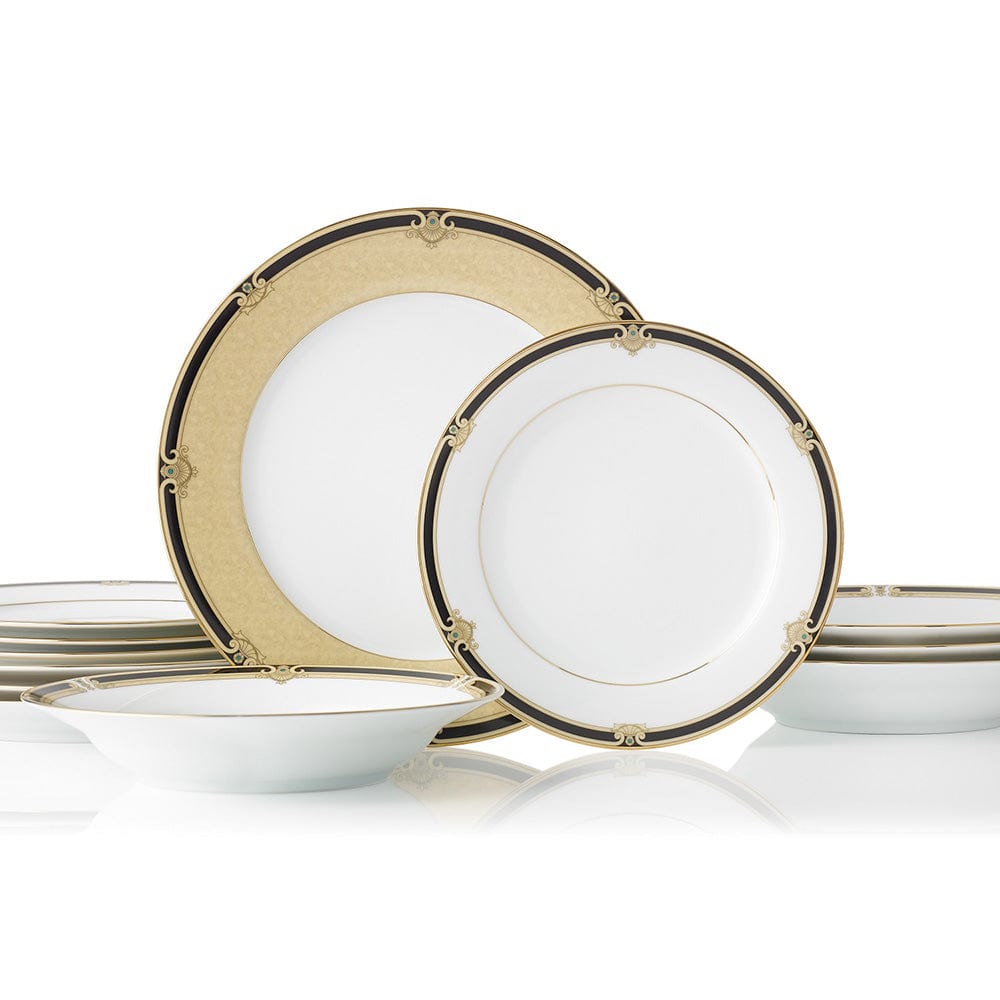 The Noritake Braidwood 12 Piece Dinner Set is a genuine classic, with regal detailing in spades. The Braidwood is a sumptuous formal design manufactured from fine white porcelain. It features a textured decal in sepia with a dark brown outer band, and a repeating shell and scroll motif in the same tones. Each shell is topped with a jewel like accent dot of emerald green, while a 22K gold trim adds an elegant final touch. A genuine classic, Braidwood combines contemporary sensibilities with a more traditional rustic feel and is ideal for all dining occasions. Designed in Japan, Braidwood is Chip Resistant and Dishwasher Safe. Noritake has been a bastion of ceramic artistry and craftsmanship around the world since 1902, after growing out of the Morimura Brothers trading company in New York City. Each piece is imbued with the same spirit and thoughtfulness of the first Noritake factory, established near Nagoya on the Japanese mainland.