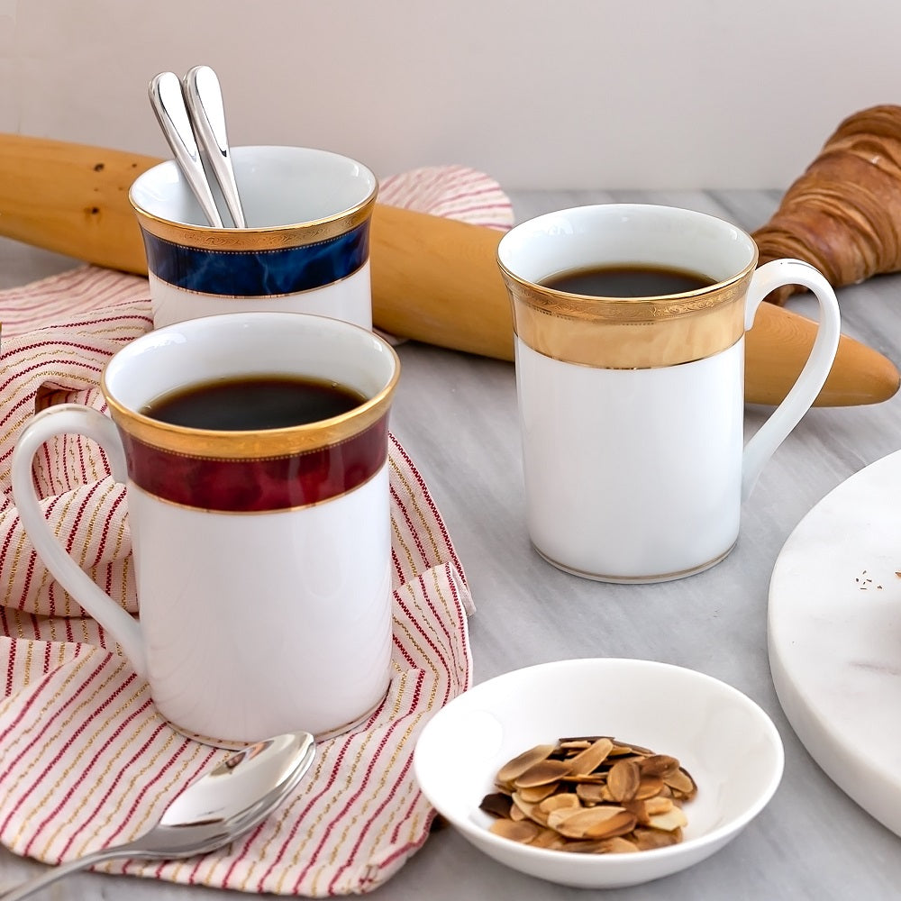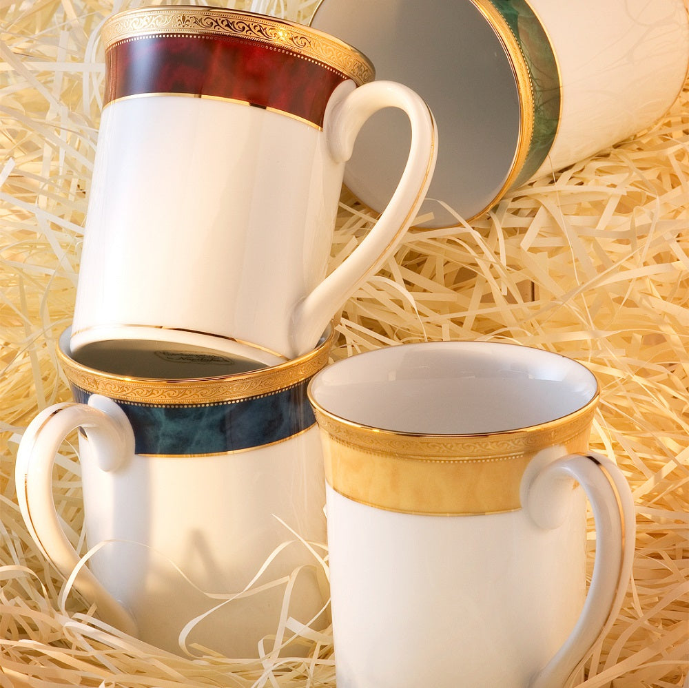 Take pleasure in an opulent teatime with the Noritake Majestic Mug 310ml. Beautifully crafted from chip-resistant fine white porcelain, the Noritake Majestic Mug 310ml cuts an elegant aesthetic atop the table. Its tall, beaker-style silhouette is perfect for keeping your beverage warm, while the sleek handle is a delight to hold. A regal faux marble finish in a mesmerising, choice of colours graces the exterior of the mug, which is complemented by breathtaking, embossed 22k gold banding. Available in a selection of equally magnificent colours, the stunning Noritake Majestic Mug 310ml is guaranteed to enhance the enjoyment of your favourite hot beverages. This mug is dishwasher safe and is presented in a stylish box for effortless gifting.