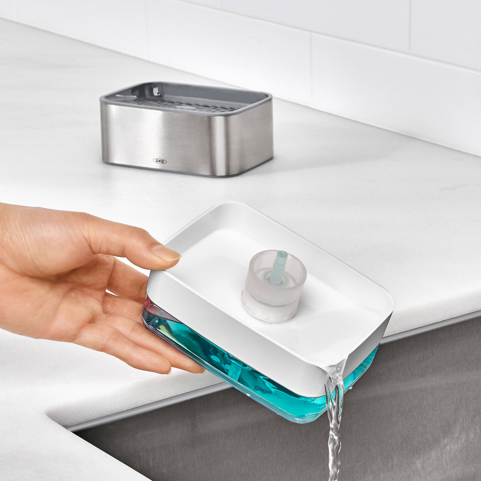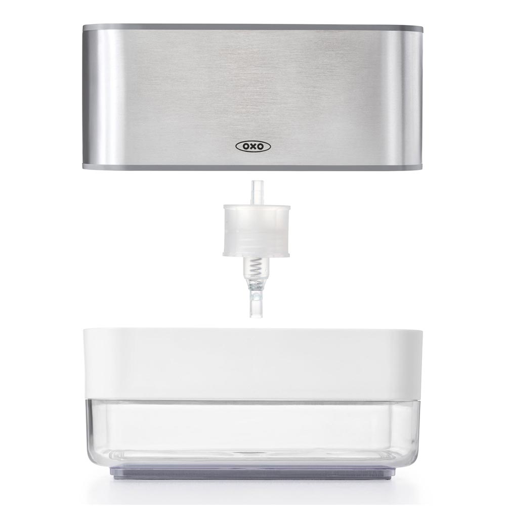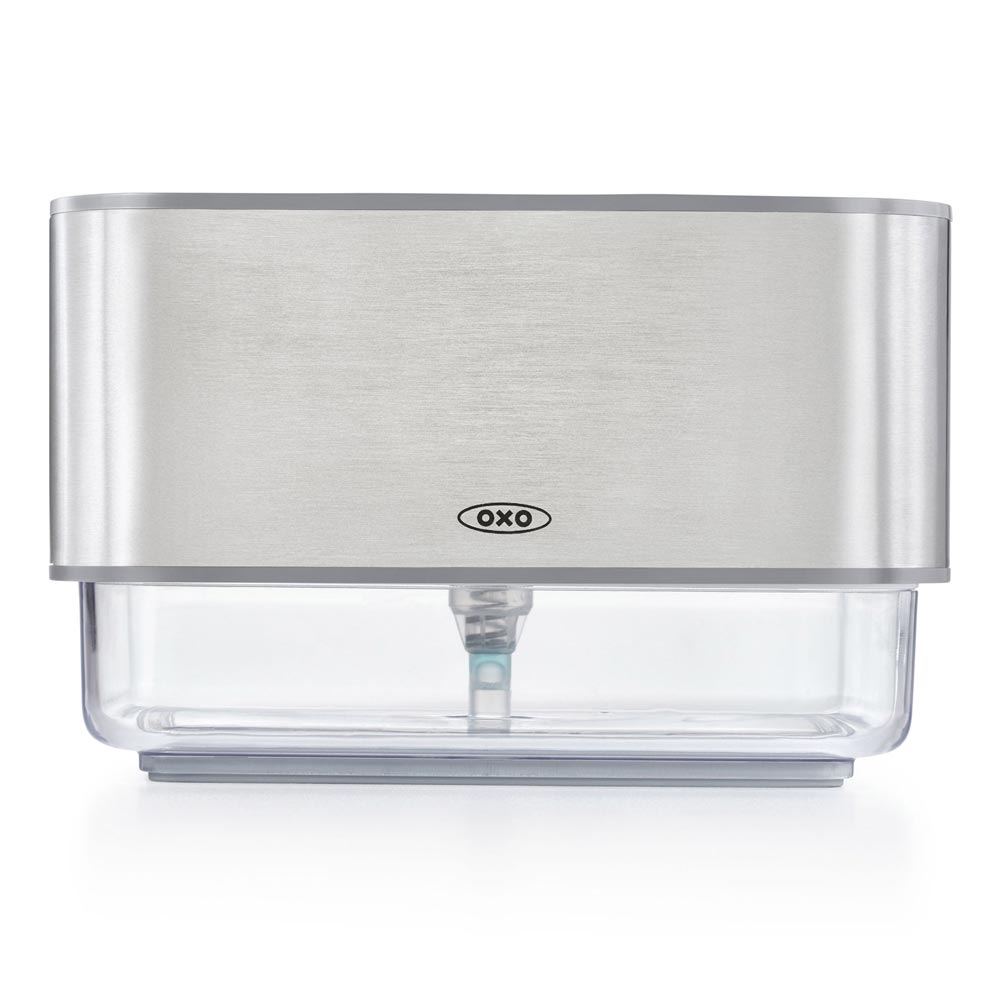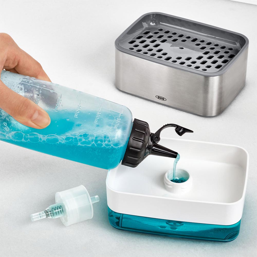 Bring an end to messy soap bottles on your countertop with the OXO Soap Dispensing Sponge Holder. Get soap on demand with an easy, one-handed press. The ventilated, elevated holder promotes quick drying, while the drip tray catches excess water from sponges. With an internal soap cap that prevents water from mixing into dish soap, and a clear body that shows when it’s time for a refill, the OXO Soap Dispensing Sponge Holder is an essential item for every kitchen.