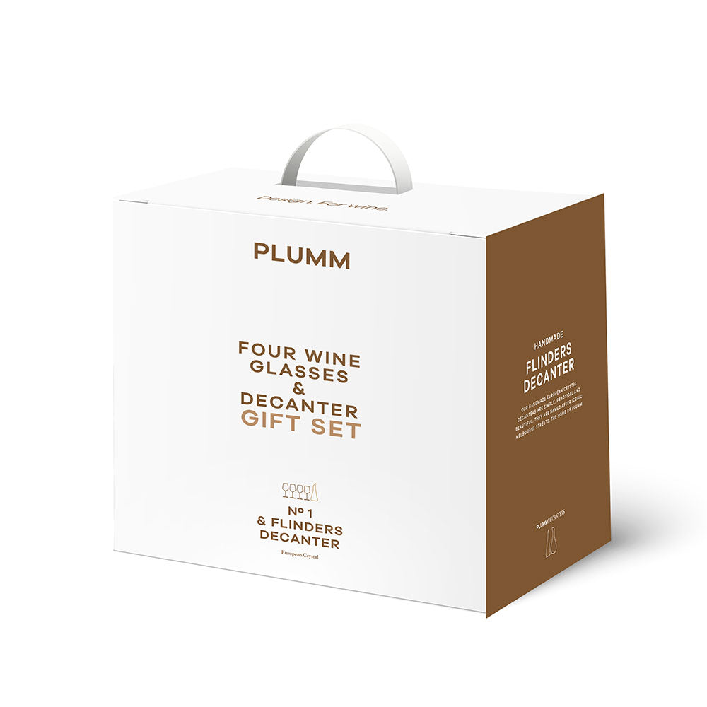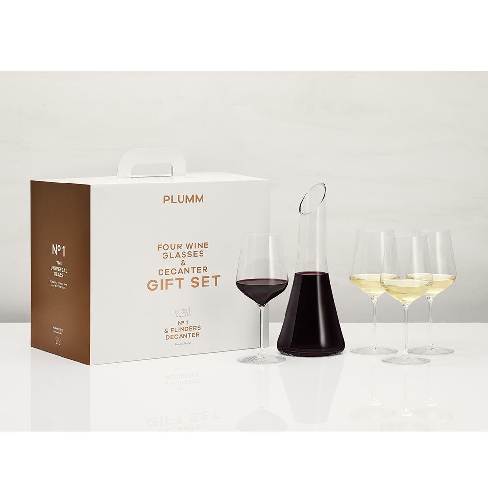 The perfect gift for any wine enthusiast. Plumm's No 1 & Flinders Decanter Gift Set includes four universal wine glasses as well as the Flinders Decanter. The universal wine glass is intended for all types of wine, including red and white. It is also well-suited to full-bodied reds. Designed in collaboration with leading Australian sommeliers to enhance the modern wine and dining experience, these glasses are made of ultra-fine European crystal. The Flinders Decanter is a handblown European crystal decanter suitable for both full-bodied and medium-to-light-bodied red wines. Gift Set contains: 4 x No 1 The Universal Glass 610ml, 1 x Flinders Decanter 1L.