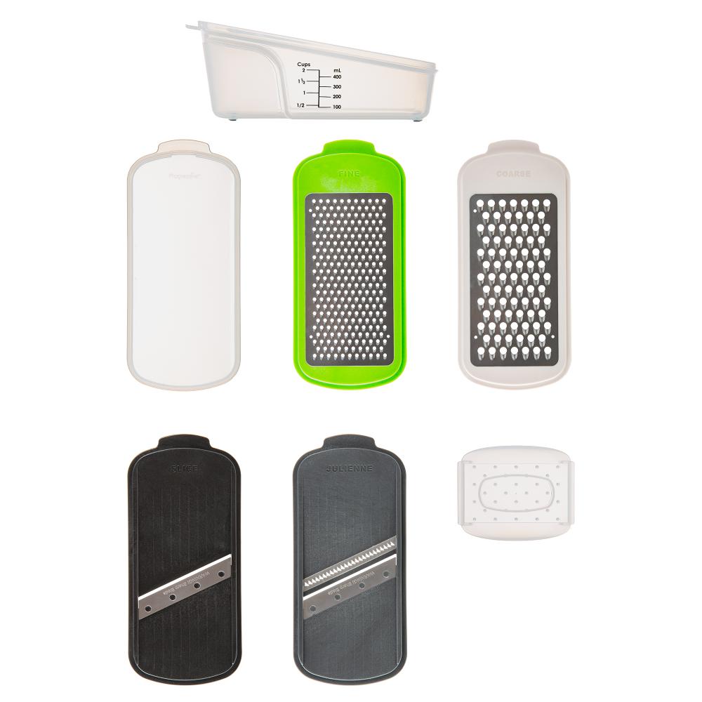 • Includes coarse grater, fine grater, straight slicer & julienne slicer