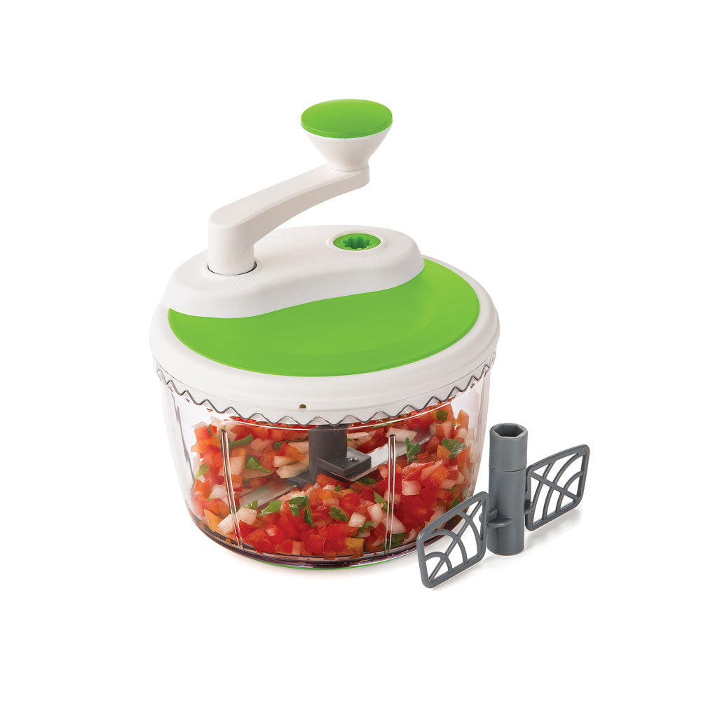 The Progressive Prepworks 2-Speed Chop & Whip is a helpful addition to any kitchen. The genius design of this multitasker will cut down on time spent chopping and make whipping ingredients effortless. This clever kitchen companion has a large, flat soft-grip lid and non-skid base for secure spinning. Featuring interchangeable attachments and 2 speed settings to tackle whatever comes its way, you can swap between its blade and paddle to chop everything from onions and vegetables to nuts and biscuits for baking or whip cream and egg whites with ease. The easy to use handle can be inserted in different gears to change speeds, and can be rotated in both directions for smooth operation.