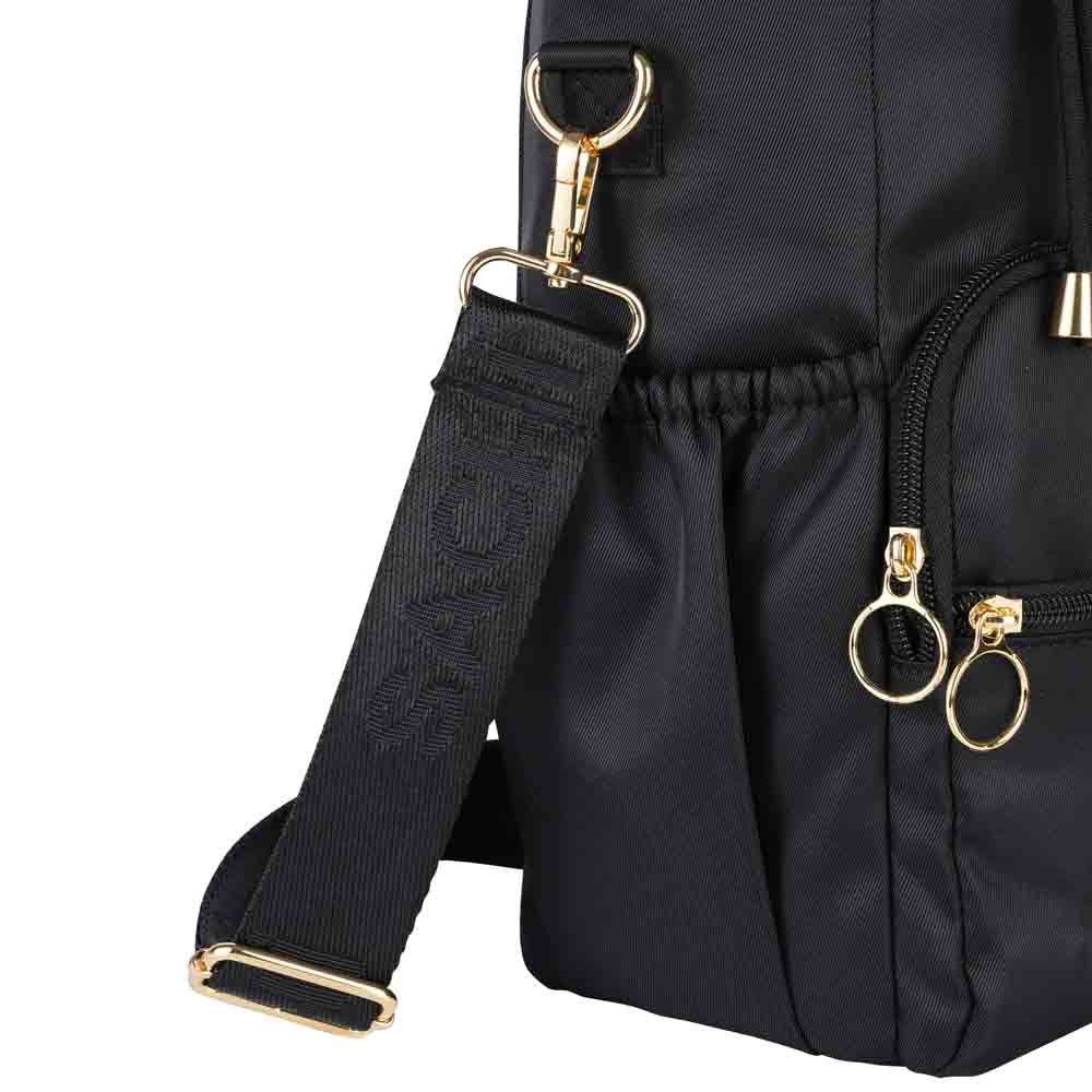 • Quality gold-coloured hardware. Includes twin side pockets, dual zipped front pockets, with internal slip pocket and key clip.