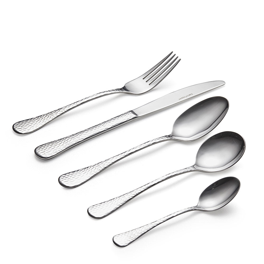Indulge in the art of dining with the Salt & Pepper Moscow 30 Piece Cutlery Set. Each piece boasts a unique hand-hammered finish, creating an artisan allure that elevates every meal. Crafted from premium 18/10 stainless steel, the Salt & Pepper Moscow 30 Piece Cutlery Set combines striking style with everyday convenience, as it's dishwasher safe. The ergonomic design ensures a pleasurable dining experience, making it perfect for any occasion. With six meticulously designed place settings, including a table knife, fork, soup spoon, dessert spoon, and teaspoon, the Salt & Pepper Moscow 30-piece Cutlery Set is beautifully gift-boxed, making it an exquisite and practical present.