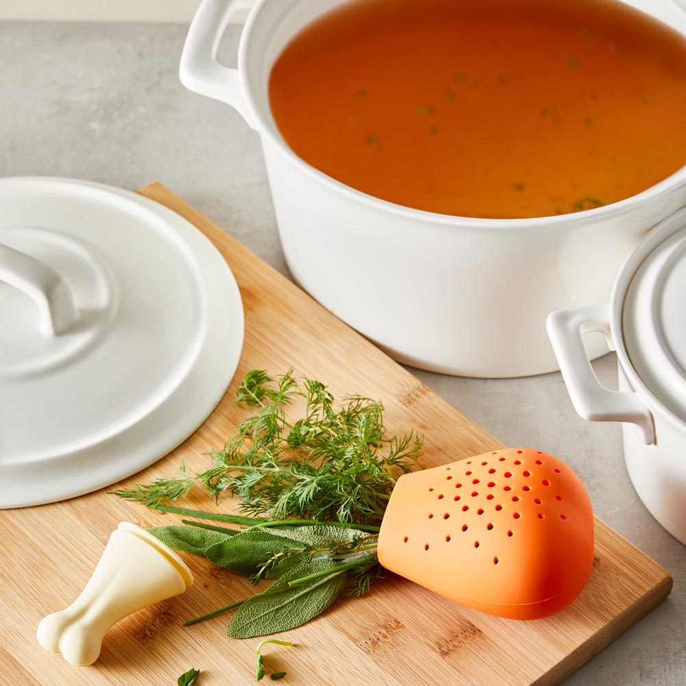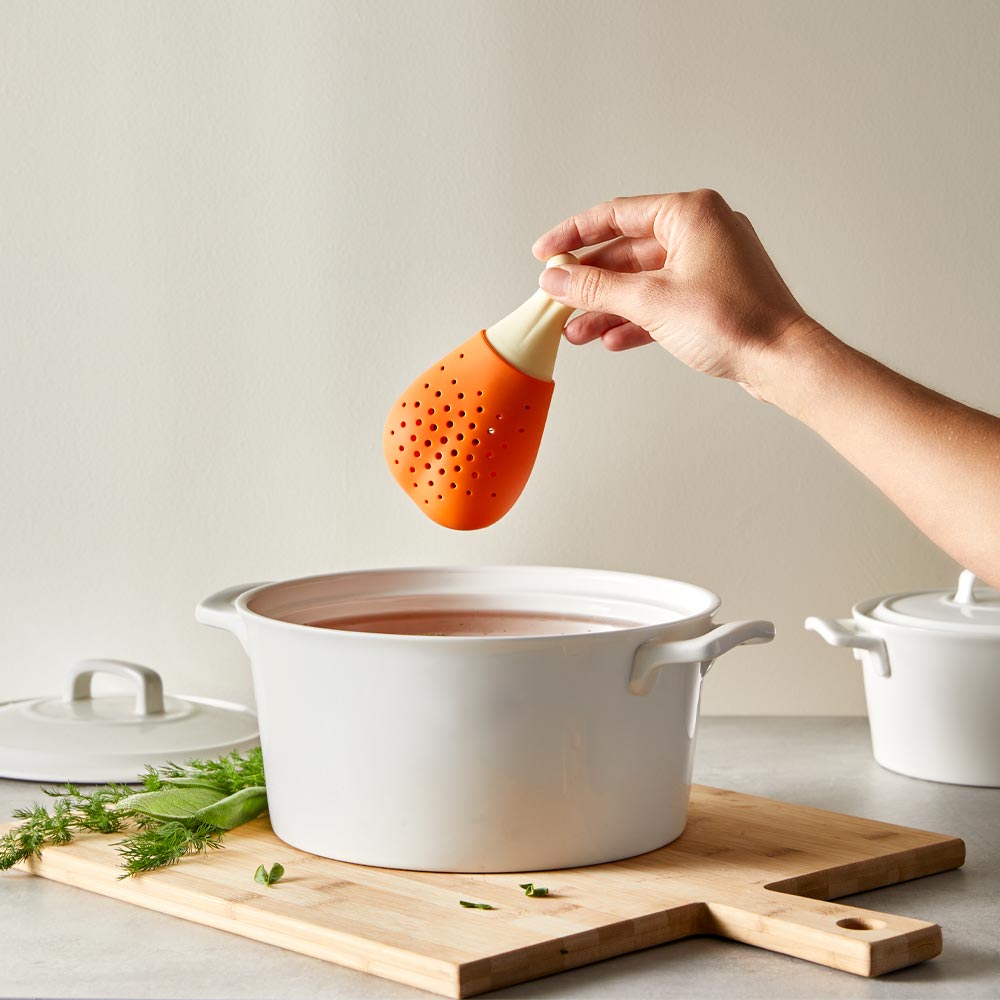 The Scullery® Essentials Herb Infuser is your kitchen's secret weapon for a burst of flavour in every bite! Elevate your culinary creations effortlessly with this clever gadget. Crafted from high-quality, food-grade silicone and shaped like a tasty chicken drumstick, the Scullery® Essentials Herb Infuser adds a touch of whimsy to your kitchen. Simply follow the two easy steps: load the infuser with your desired herbs and spices, then let it steep in your pot. Watch as your soups, stews, and broths transform into flavour-packed masterpieces. The herb infuser ensures herbs stay contained while infusing maximum taste. And cleanup is a breeze – toss it in the dishwasher for stress-free maintenance. Unleash the chef in you with the Scullery® Essentials Herb Infuser!