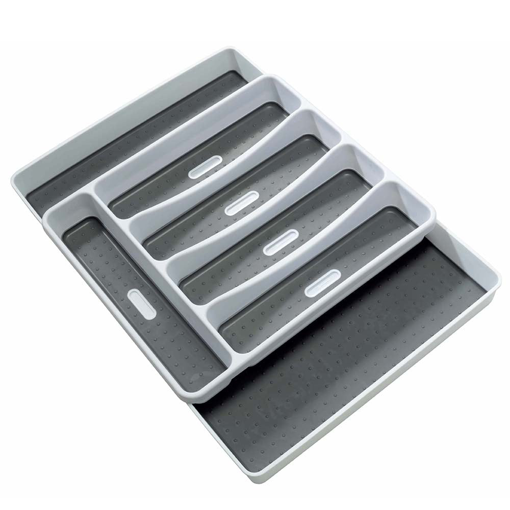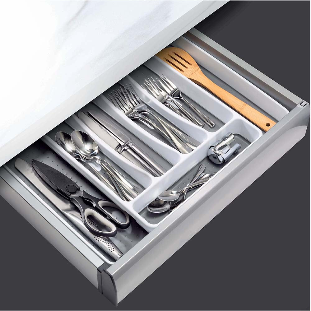 Tired of rummaging around your drawers looking for the right utensil? You can organise your cutlery collection with the Scullery® Pura II Expand Drawer Organiser. It is a practical and efficient way to create more space in your cutlery drawers and have everything you need organised neatly and within easy reach. It features expandable deep sides for storing larger utensils and big collections of cutlery. This drawer organiser is compatible with all standard drawer sizes and is the ideal storage solution for all your knives, forks, and spoons. Made from highly durable plastic material, it is high quality and built to last. It’s easy to keep clean, and to install or remove from your drawers as needed.