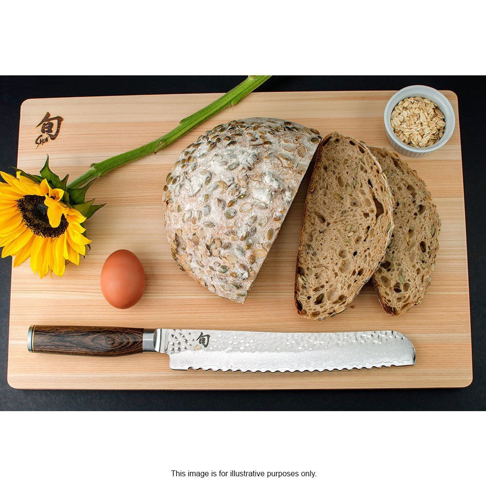 Create perfect slices of fresh bread with the stylish, razor-sharp Shun Kai Premier Steel & Pakkawood Bread Knife 22.9cm! Ideal for slicing through delicious sourdough bread, cob loaves and more, this knife will achieve perfect slices without crushing the loaf. Handcrafted in Japan, the Premier Bread Knife is designed with beautiful Damascus cladding on each side of the blade for a touch of elegance and sophistication. Constructed with VG-MAX steel blade, this bread knife offers enduring strength and durability to withstand everyday use. It features a stylish walnut-coloured pakka wood handle which offers fantastic grip and balance while slicing through loaves of bread. To care for this knife, simple hand wash and immediately dry. Slice through your favourite style of bread smoothly and cleanly with the Shun Kai Premier Bread Knife!