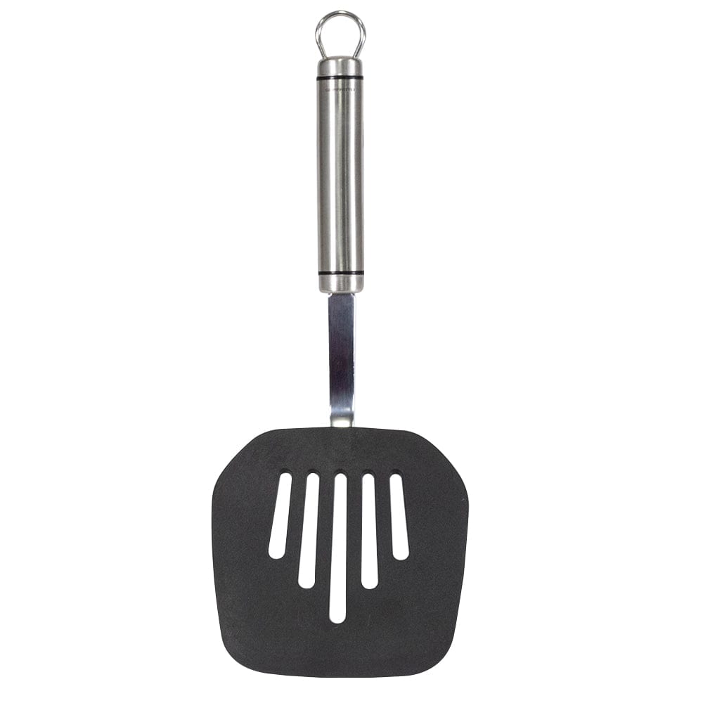 Craft your weekend pancakes with ease using the Soffritto® A Series Nylon Pancake Turner. Both functional and practical, the Soffritto® A Series Nylon Pancake Turner assures ultimate performance in the kitchen. This utensil is designed to craft your weekend pancakes with ease, with specially moulded slots to deter sticking from your batter mix. A high quality 18/10 stainless steel frame is built to last through the years, without compromising on feel. The well balanced handle features a loop for hanging, ensuring convenient and neat storage in your kitchen. The Soffritto® A Series Nylon Pancake Turner is a part of the Soffritto® A Series range, meaning it is designed and engineered to the highest professional standards. With their modern and sophisticated black trim, each product in the A Series range is designed to emulate the precision tools of professional chefs, no matter where and when you coo