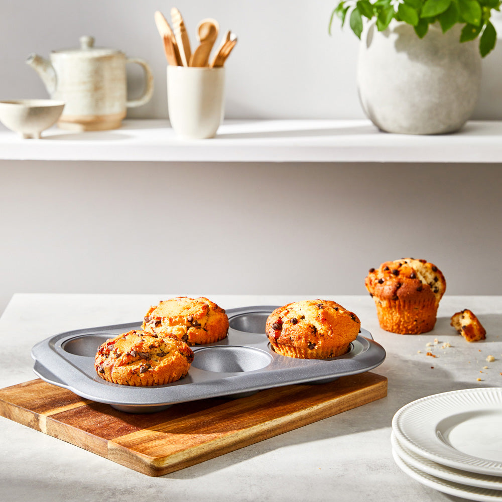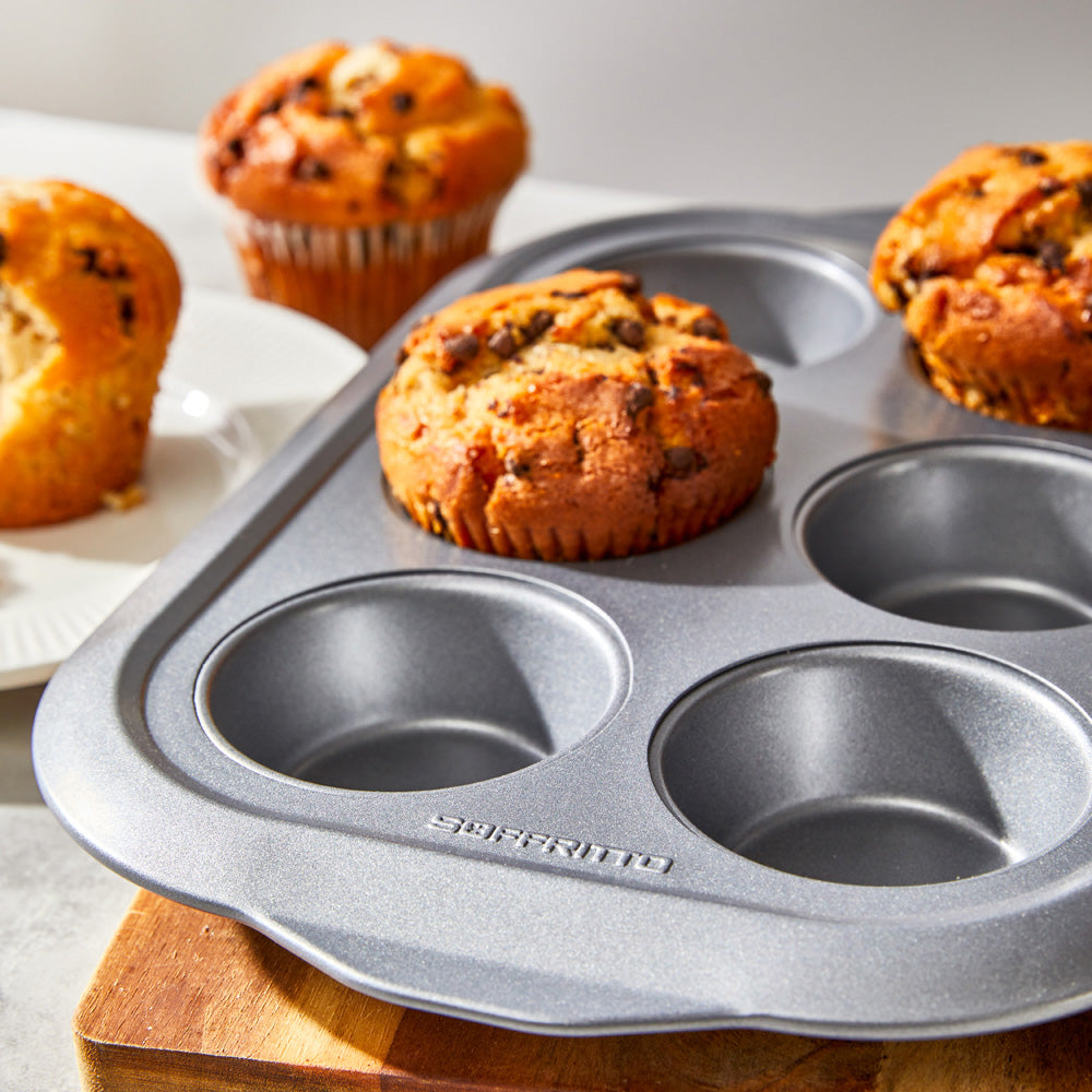 Muffins taste good at any time of the day – breakfast, morning tea, and afternoon tea! Bake bakery ready muffins with the Soffritto® Commercial II 6 Cup Muffin Pan. The Soffritto® Commercial II range of trays, pans, and crispers are designed for durability to make every day baking a breeze. Soffritto® Commercial II bakeware features quality non-stick coating and is made from resistant carbon steel to provide even heat distribution and ensure the very best baking results. The bakeware is finished with a durable non-stick coating to facilitate the easy release of baked goods. The Soffritto® Commercial II 6 Cup Muffin Pan is an essential bakeware item for all muffin lovers wanting the best blueberry muffins, or choc chip ones if that’s your muffin of choice.