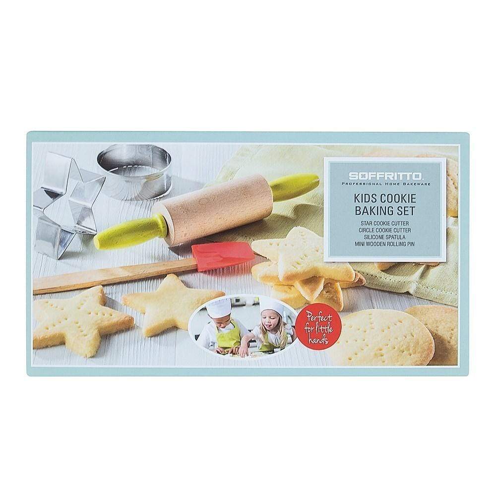 Includes star cookie cutter, circle cookie cutter, spatula and rolling pin