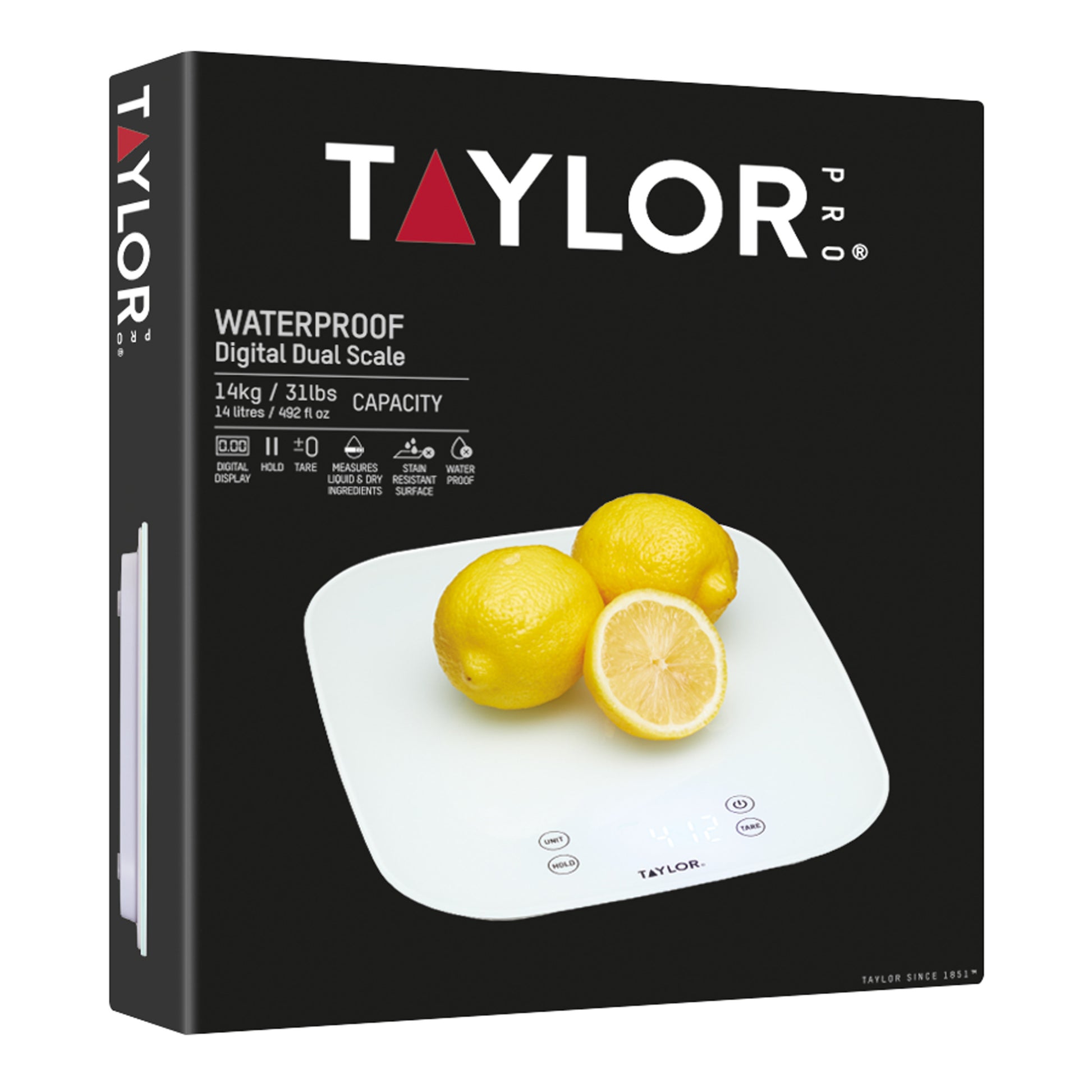 Turn home and commercial kitchen prep into an easy task while keeping your cooking space hygienic with the Taylor Waterproof Digital Dual Kitchen Scale, you can wash these scales in the sink! Tested to a depth of one metre, they're safe to be submerged for up to 30 minutes. Weigh both wet and dry ingredients up to 14 kg (31 lbs) or 14 L (492 fl oz) and easily switch between pounds, ounces, fluid ounces, grams and millilitres using the UNIT button. Lock in the weight by pressing HOLD, while the TARE button will zero everything out again. Say goodbye to sticky, greasy or smelly mess as the glass surface is stain and odour-resistant too!