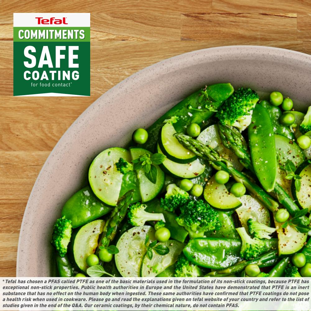• Safe non-stick coating: As part of our commitment to uncompromising standards of safety, all of our food contact non-stick coatings are free of PFOA, lead and cadmium. Tests are realized by external independent laboratories with stricter controls than those required by current food contact regulations (Tefal has chosen a PFAS called PTFE as one of the basic materials used in the formulation of its non-stick coatings, because PTFE has exceptional non-stick properties. Public health authorities in Europe and the United States have demonstrated that PTFE is an inert substance that has no effect on the human body when ingested. These same authorities have confirmed that PTFE coatings do not pose a health risk for food contact. Please read the explanations on your local Tefal website and refer to the list of studies given at the end of the Q&A Our ceramic coatings, by their chemical nature, do not contain PFAS).